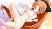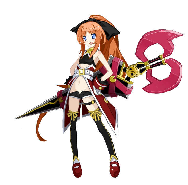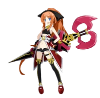 Like other character designs in Mugen Souls, some of the accessories look like they resemble the inifinity sign or an "X" shape. The color of her outfit and design is similar to Chou-Chou Sadist. She wears a pair of black shorts with a red pirate-like cape around her waist and a tank top. Nao has a long ponytail that goes along with the large ribbon. Her height is about the size of an adult female. She has orange hair and blue eyes.