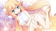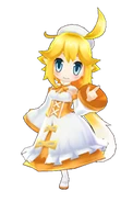 Syrma has a medium bust and average height. She has long blonde hair which can reach down to her feet. The tips of her hair are white. She has blue eyes and pointy ears. Her outfit is blue and it consists of three hair accessories, thigh high white socks and blue shoes. There are also rose hearts on the center of her outfit. On her back is a heart-shaped pouch with the sign of Virgo on it.